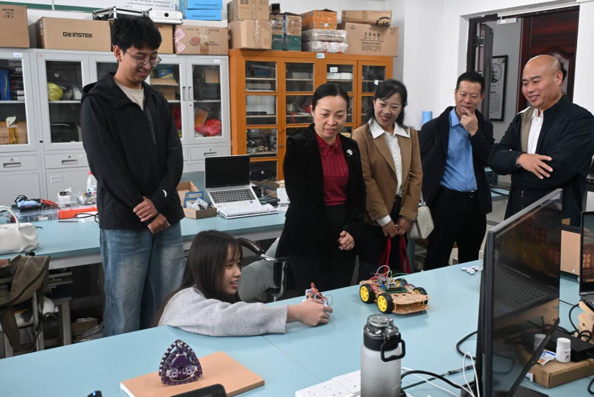 座谈会前,龙妮娜副校长一行走访了物理演示实验室、电子竞赛实验室、科学探究俱乐部等多个实验教学与创新实践基地,认真听取了指导老师和同学们对各类参赛作品的介绍,对已取得的成绩表示赞许,并鼓励大家要进一步丰富拓展创新实践平台建设,充分发挥好特色创新平台的育人作用,吸引、带动更多的师生参与到各类科技创新项目活动中来,研发出更多兼具创新性与实用性的科技成果,在动手实践中培养创新思维,让所学知识在解决实际问题中发挥更大价值。